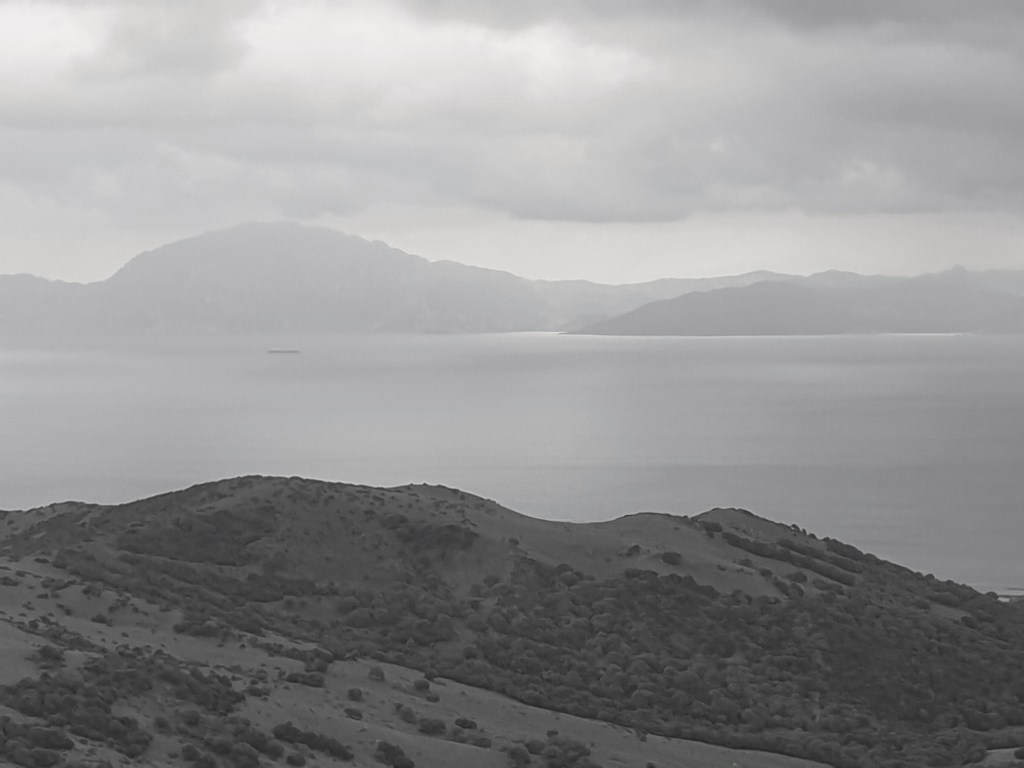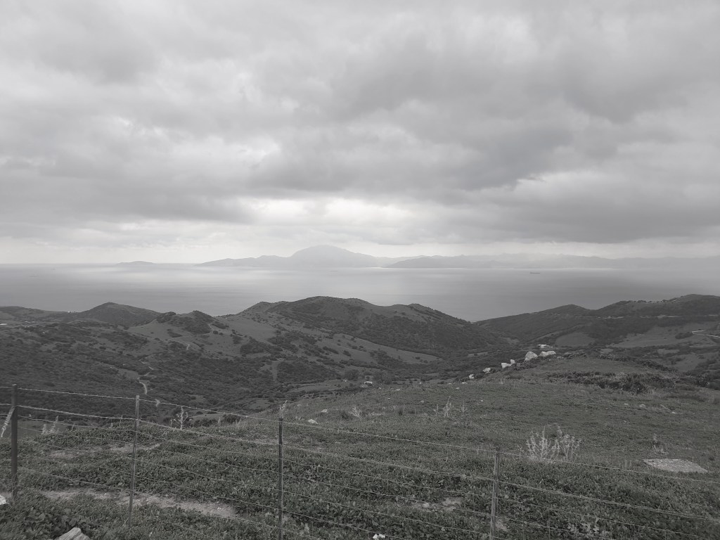 Ese día tenía que haber recorrido el final del primer sector de la ruta 47 (Barbate con la Playa de La Yerbabuena y Zahara de los Atunes), y el segundo sector completo, la carretera del Estrecho, recorriendo Tarifa, Puerto del Cabrito (340 m), Puerto del Bujeo (330 m) y finalmente Algeciras, para posteriormente enlazar con Málaga e iniciar la ruta 44. Sin embargo, eran las 14h y ya me había resignado al cambio de planes, por rápida que fuera la reparación, tendría que hacer noche en Marbella y seguir al día siguiente. Le comenté al taxista la situación, y le dije que lo que más lamentaba era no visitar El Balcón del Estrecho, un mirador formidable situado cerca de Algeciras, entre los puertos del Cabrito y El Bujeo. Tal vez, cuando vuelva al Restaurante Trafalgar y al Parque de la Breña, me asome también por este sitio. Media hora después, para mi sorpresa y sin yo pedirlo, el taxista estaba aparcando el taxi. – Pues esto es el Balcón del Estrecho, date una vuelta, tómate tu tiempo, y cuando quieras, me lo dices y seguimos. El sitio es impresionante, igual que la gente de Cádiz, yo no sé qué tiene el aire, pero la simpatía y relajo de la gente de esa tierra es espectacular. Yo siempre he dicho que lo mejor de Andalucía en Cádiz, sobre todo por su gente. El Balcón del Estrecho es uno de los pocos lugares del mundo desde los que puedes divisar, con total claridad, dos continentes al mismo tiempo. Las vistas son grandiosas, con el mar, el cielo, África al frente, y detrás y a los lados las montañas con sus grandes hélices. Fumé un rato disfrutando del sitio, e incluso cambié unas palabras con un motorista que tomaba café, sólo, en el mirador, junto a una bonita Café Racer.