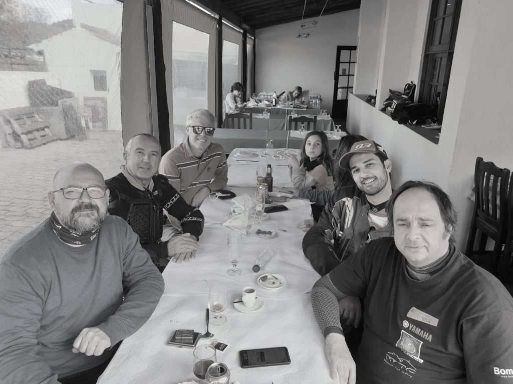 El tiempo voló y algo antes de la una llegó Joao con su DR 600 del pleistoceno. Tiene 3 DR y él mismo las arregla y las restaura. Venía de hacer campo, y unos minutos después llegaron 2 amigos más, también con motos de campo. Y luego llegaron en dos motos una pareja con una peque de unos 9 ó 10 años que estaba disfrutando de su primera salida en moto, aunque ellos por carretera, y ya estábamos los 7 para comer. Joao habla bien español, y de sus amigos, dos hablaban también lo suficiente para charlar un poco. De todas formas, la mayor parte del tiempo Joao y yo estuvimos hablando en español de nuestros viajes pasados y futuros, y los demás, como es natural, estuvieron hablando en portugués de sus cosas portuguesas.