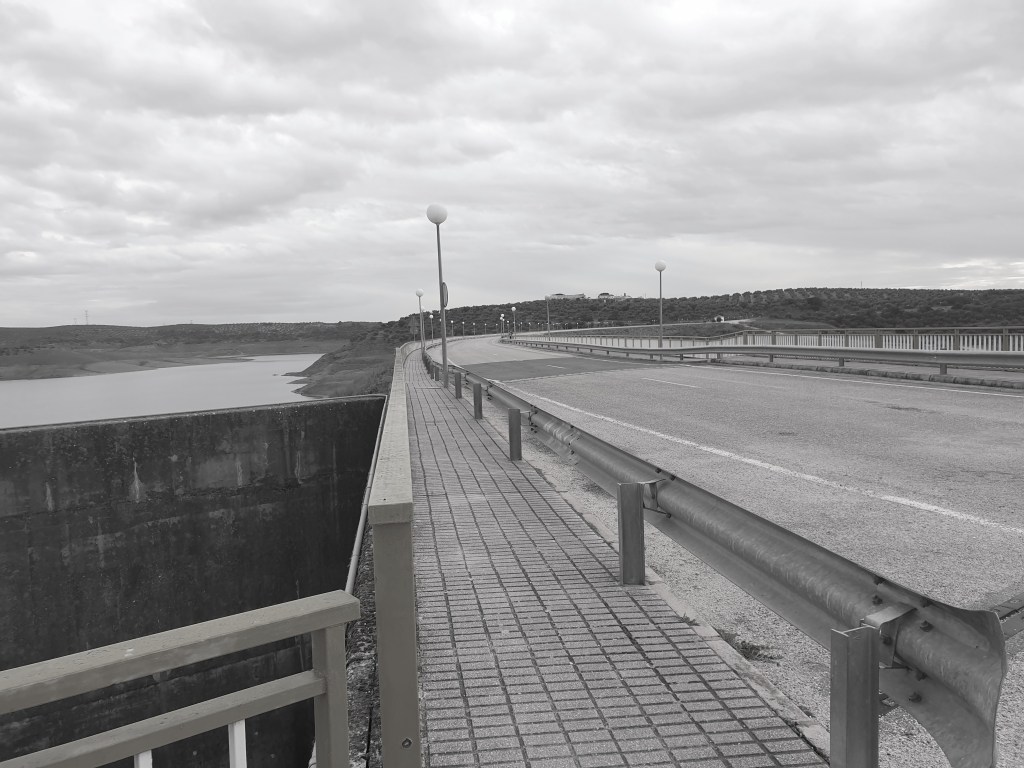 El Gran Hotel Balneario de Marmolejo. Salí de Marmolejo por la A-420 buscando la presa del río Yeguas, donde paré a descansar un rato, tomar el tercer café del día, alguna fruta y un cigarro. Coincidí en mi parada con un matrimonio con un niño pequeño, su mamá se esmeraba en limpiarlo todo y en que no tocara nada, tarea difícil. Me alejé un poco para no molestar con el humo, tomé algunas fotos sin demasiado interés y me marché.