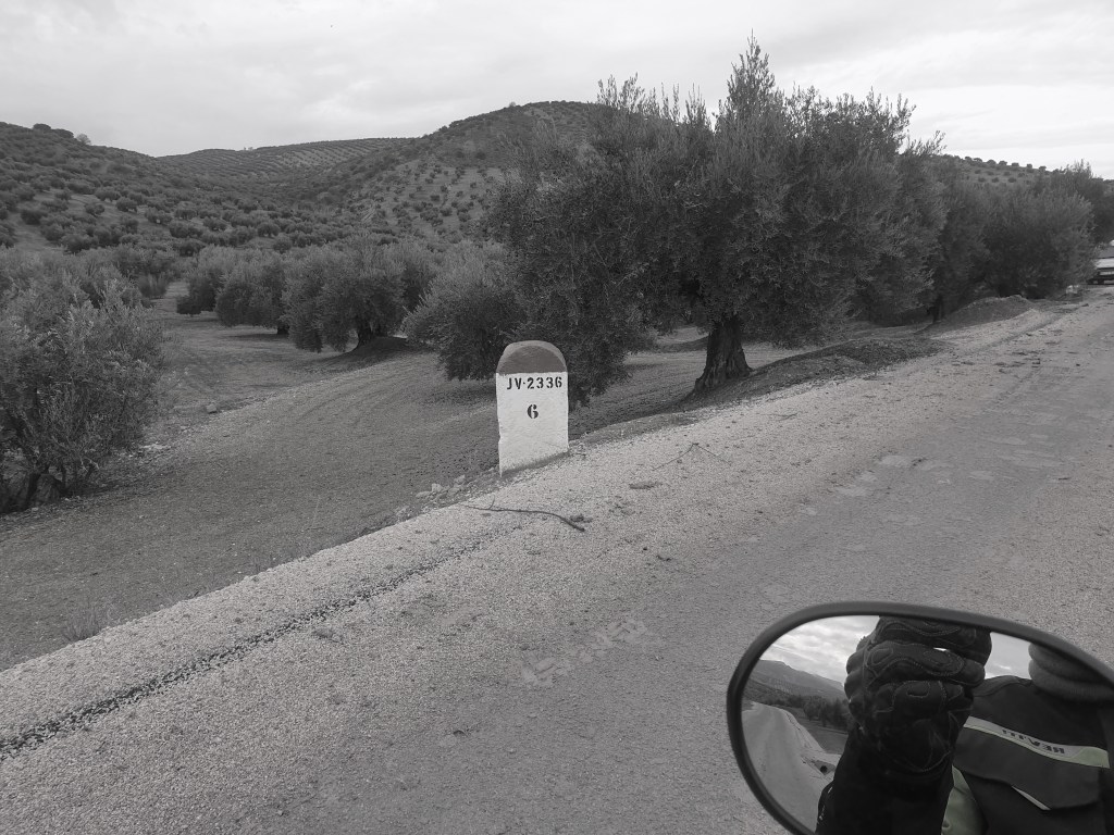 Puerto de los Alazores (1.028 m) en la Axarquía. Justo en el límite entre Málaga y Granada. Un olivar gigante, es el siguiente sector, que nos lleva, en primer lugar, hasta Loja, aún por zona montañosa. Loja me gustó, un pueblo grande con mucho frío, cuestas y bonitas vistas. Sales de Loja por la A-4154, y vas buscando el Puerto de los Ventorros de Zagra (900 m). Me costó localizar el puerto, a la altura de Zagra paré en medio del campo, donde había un apeadero de bus con dos señores mayores que tomaban el sol y charlaban. De fondo se oía el barear de la cosecha de la aceituna. Me fumé un cigarro con ellos, me dijeron que ya había pasado el puerto, y al yo preguntarles, me aclararon que seguramente no estaba señalizado. Dudé unos instantes si volver sobre mis pasos, un lujo que te puedes permitir cuando viajas por placer, pero ante el panorama de la ausencia de señalización, decidí seguir mi camino.